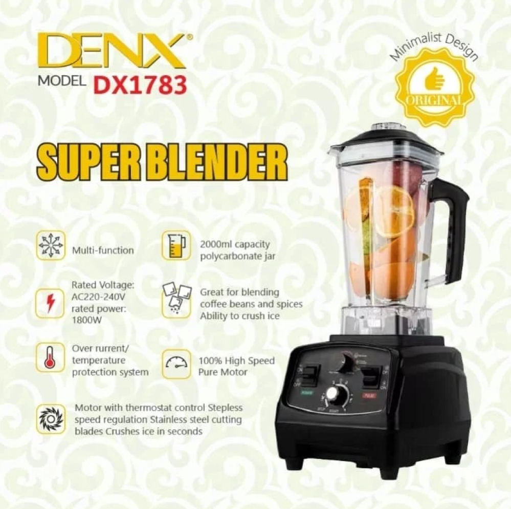 "ارتقِ بتجربة مطبخك إلى مستوى جديد مع خلاط DENX الفائق، موديل DX1783، الأداة القوية والمتعددة الاستخدامات التي ستُحدث ثورة في طريقة تحضيرك للمشروبات والأطعمة. هذا الخلاط ليس مجرد جهاز، بل هو شريكك المثالي في تحقيق أشهى الوصفات الصحية واللذيذة بكل سهولة وسرعة. بفضل محركه الجبار بقدرة 1800 واط وشفراته المصنوعة من الفولاذ المقاوم للصدأ، ستتمكن من الحصول على نتائج مثالية في كل مرة، سواء كنت تحضر عصيراً منعشاً، حساءً كريمياً، أو حتى تطحن حبوب القهوة والتوابل الطازجة."
