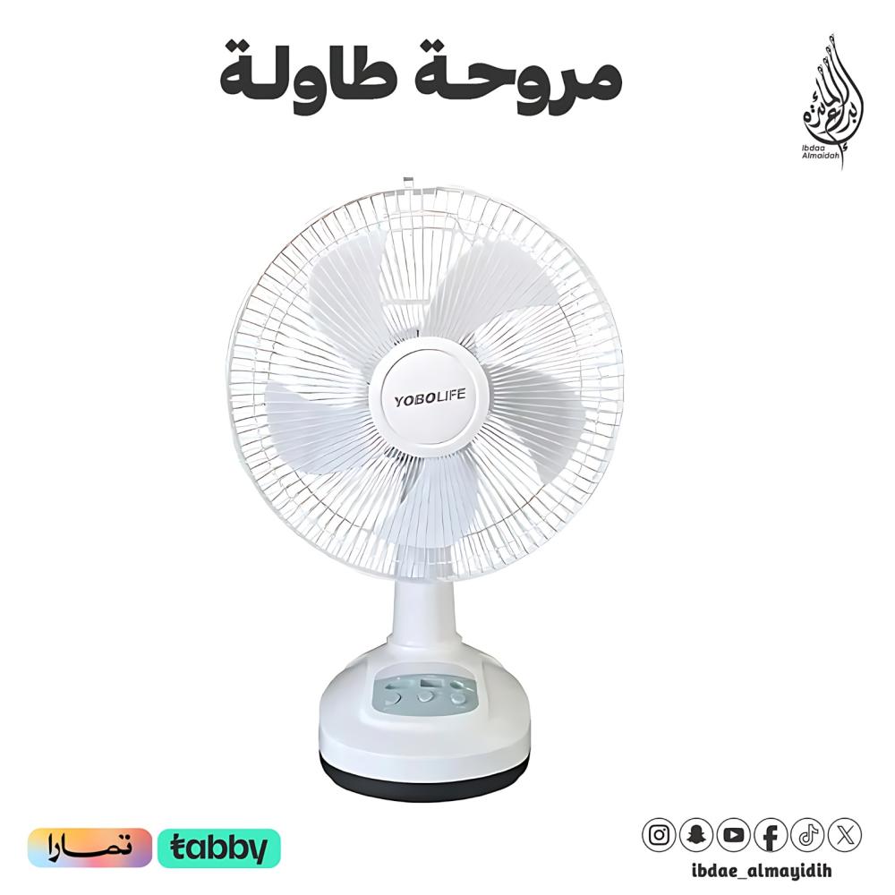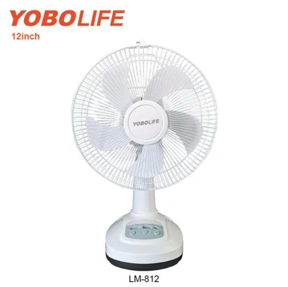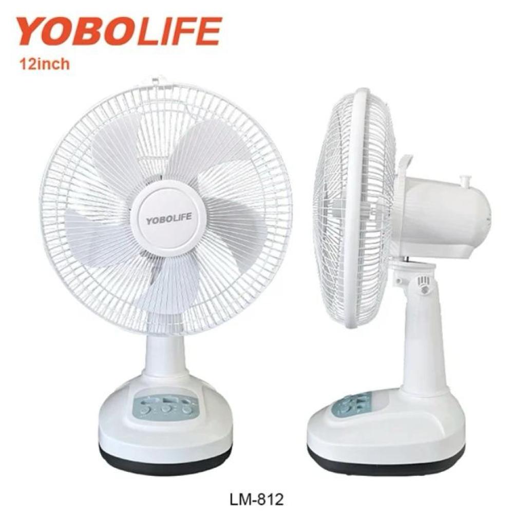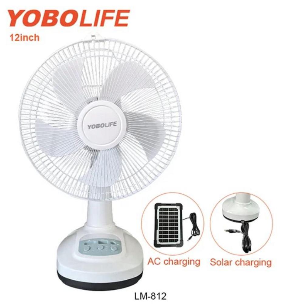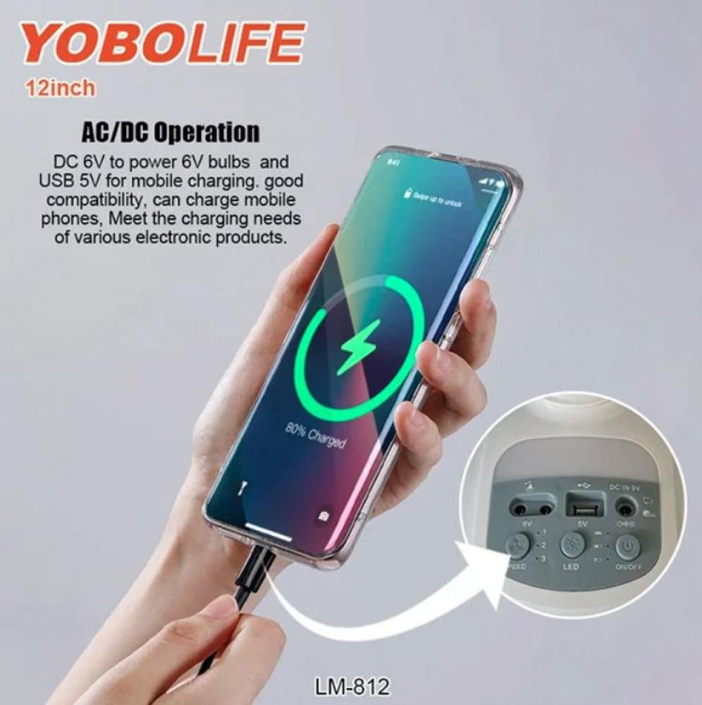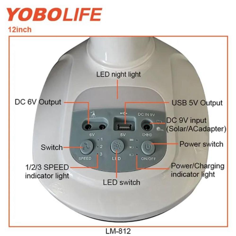 "تمثل مروحة YOBO LIFE موديل LM-812 جهازًا مبتكرًا ومتعدد الاستخدامات لتوفير تهوية مريحة وإضاءة وشحن للأجهزة المحمولة في أي مكان. تتميز هذه المروحة بحجم 12 بوصة، وإمكانية التشغيل بثلاثة مصادر طاقة (تيار متردد، تيار مستمر، وطاقة شمسية عبر لوح شمسي مرفق)، وثلاث سرعات للتحكم في تدفق الهواء، ومصباح LED للإضاءة الليلية، بالإضافة إلى منفذ USB لشحن الهواتف المحمولة."
